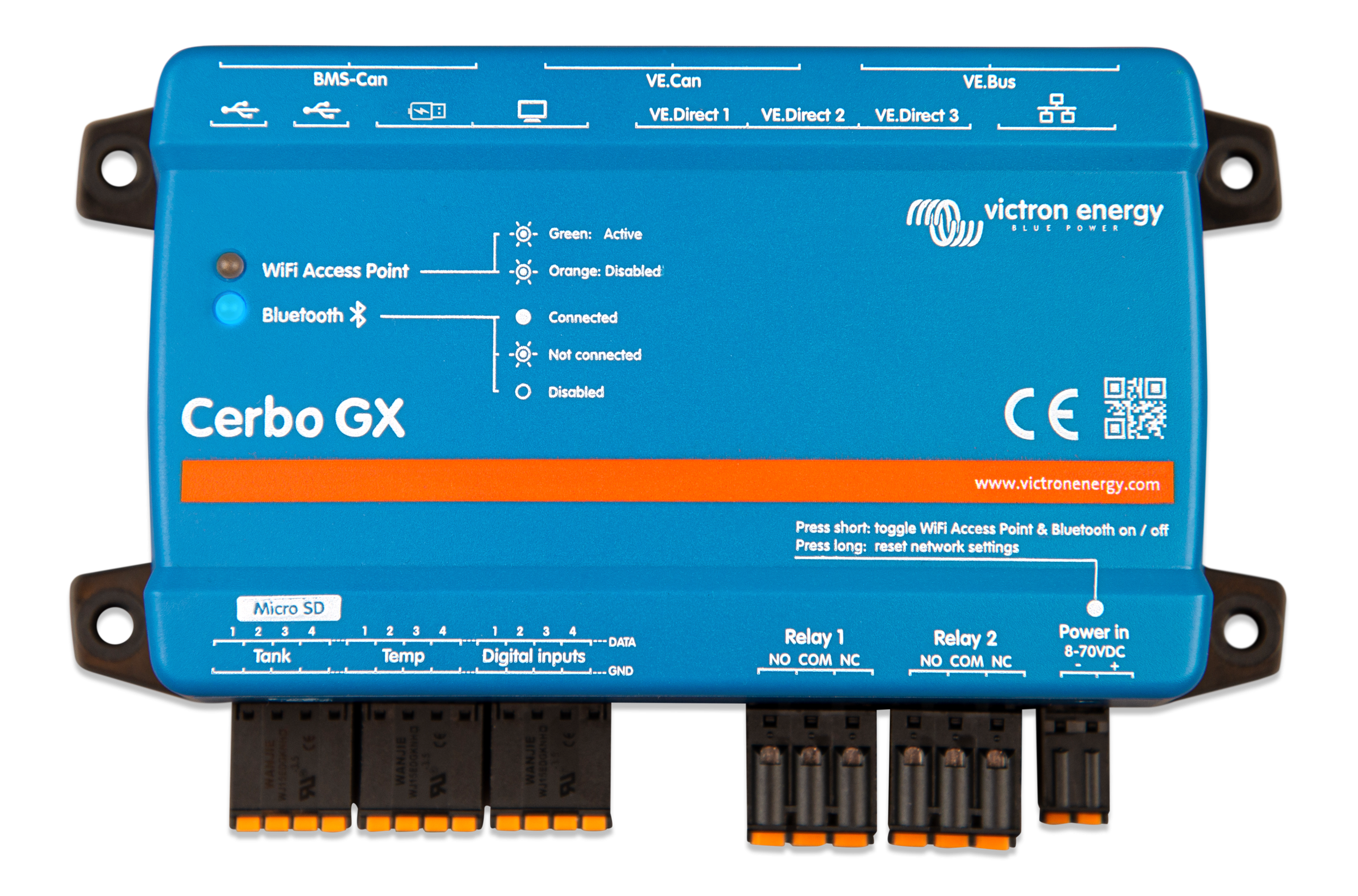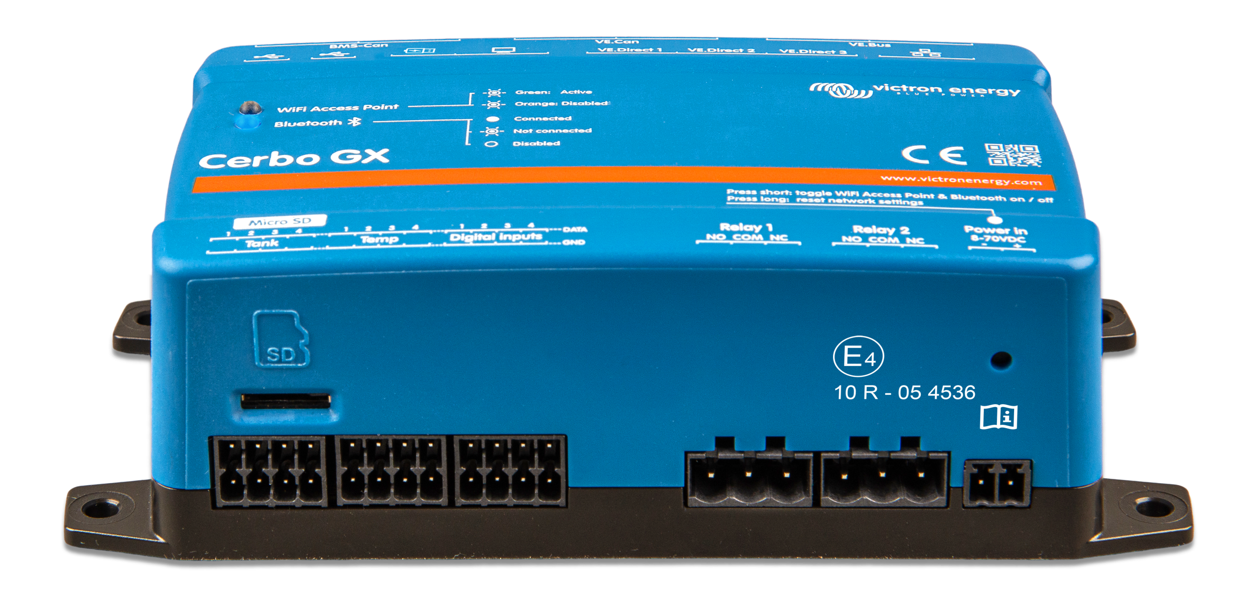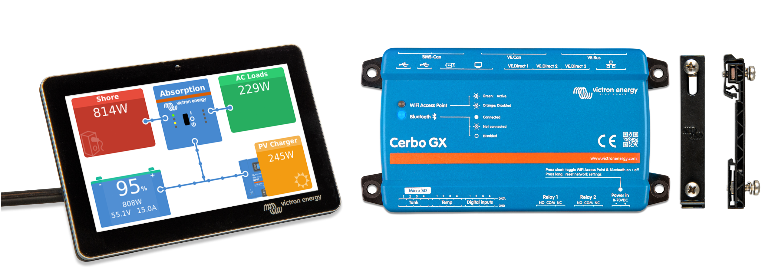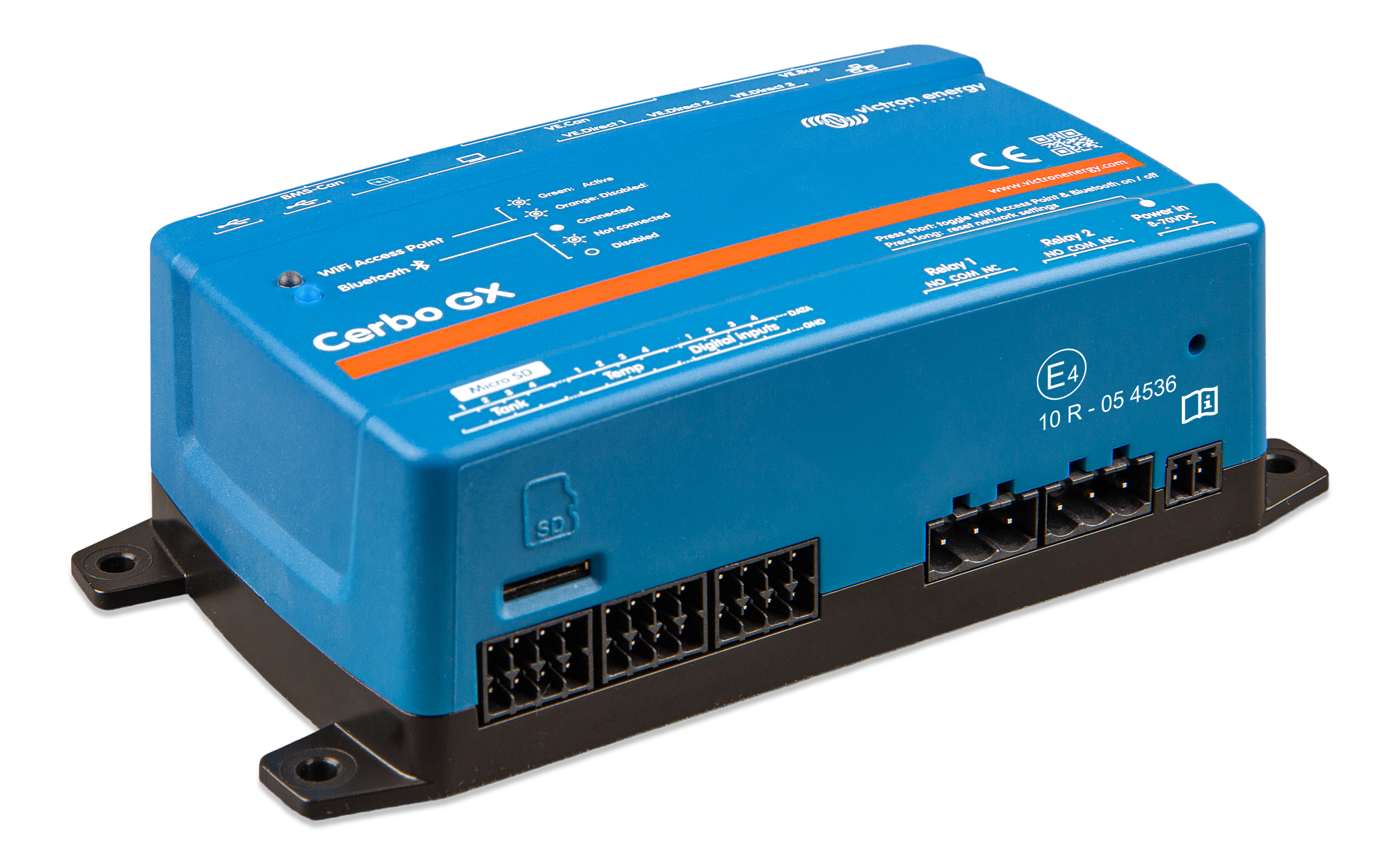 • Integración con otros dispositivos: El Cerbo GX se integra con una amplia gama de dispositivos, incluyendo sensores de temperatura, medidores de tanques y sistemas de gestión de baterías. Compatibilidad con MFD marinos.